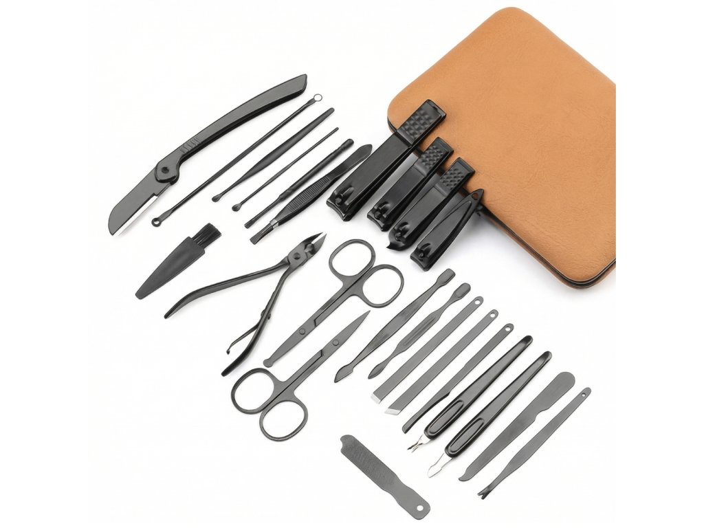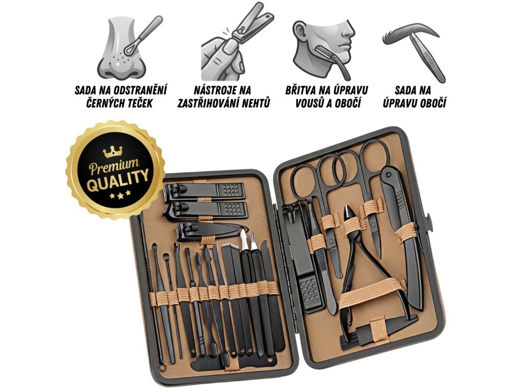 Sada obsahuje nástroje na stříhání nehtů, úpravu vousů, obočí i čištění pleti. Vše potřebné máš vždy po ruce.