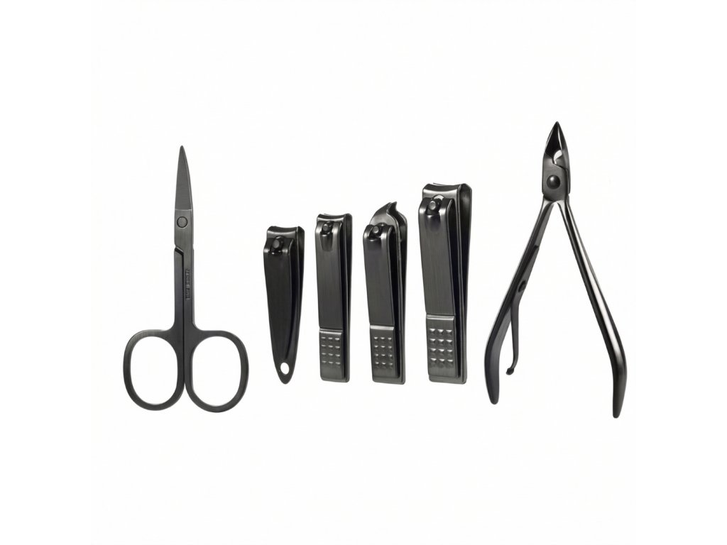 Sada obsahuje několik typů kleštiček, nůžek a pilníků pro přesnou úpravu nehtů.