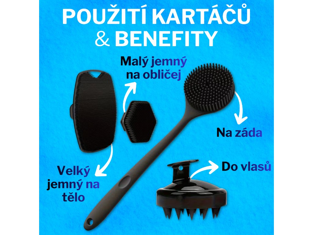 Každý kartáč je navržen pro jinou část těla, takže můžeš provádět kompletní hygienu pokožky.